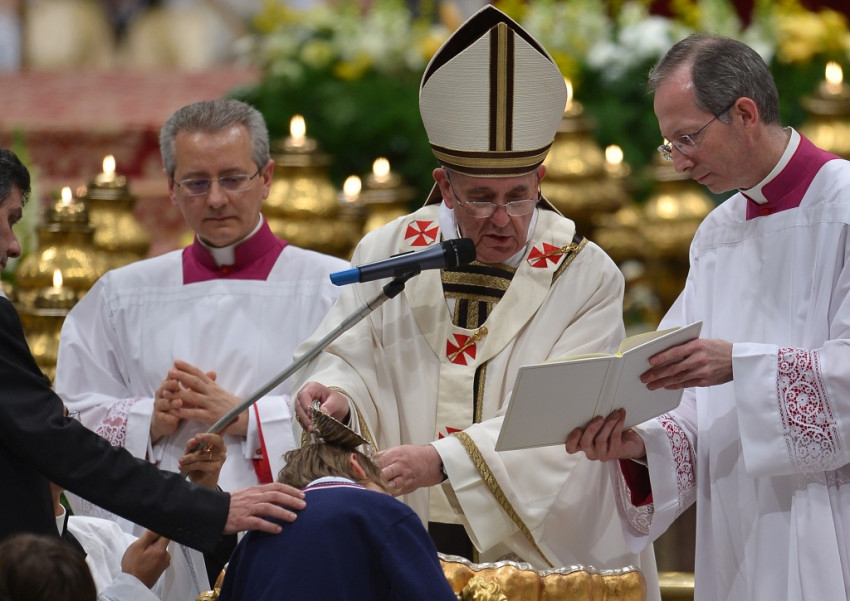 A teljesen sötétbe borult Szent Péter bazilikában kezdődött a vigília szertartása, amelyen Ferenc pápa tíz embert keresztelt meg, olaszokat és külföldieket is - tudósít az MTI.