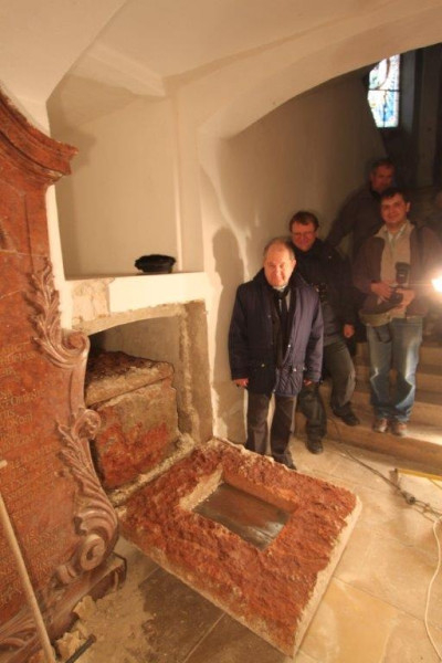 közelében, a főhajó tengelye mellett, csaknem 3,80 m mélységben, a mai