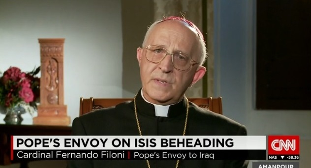 „Nem beszélhetünk háborúról, hiszen itt egészen másról van szó: terroristák egy pénzzel jól ellátott csoportjáról, amely olyan emberekből áll, akiket csak az ideológia vezérel, akik olyan embereket támadnak meg, akiknek fegyverük sincs, hogy megvédhessék magukat – minden felszerelés nélkülieket, egész egyszerű, szegény földműveseket, családokat, békés embereket, akik faluikban egyszerűen szeretnék élni életüket” – mondta Filoni bíboros a CNN sztárriporterének, a brit-iráni Christiane Amanpournak nyilatkozva.