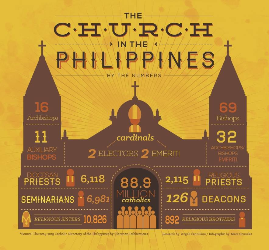 A 103 millió 775 ezer lakosú Fülöp-szigeteken a katolikusok számaránya közel 83 százalék, azaz 88,9 millió fő. A protestánsok 9 százalékban, a muszlimok 5, a buddhisták és egyéb vallásúak 3 százalékban vannak jelen.