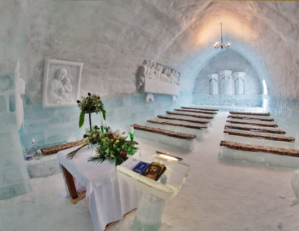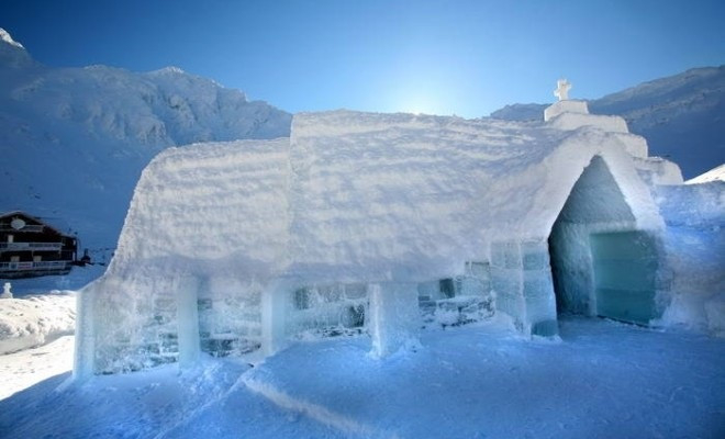 A kétezer méter magasban fekvő jégtemplom kizárólag felvonóval közelíthető meg. Az építmény, amely egy régi erdélyi templom másolata, formára vágott jégtömbökből áll, melyeket víz és hó tart össze.