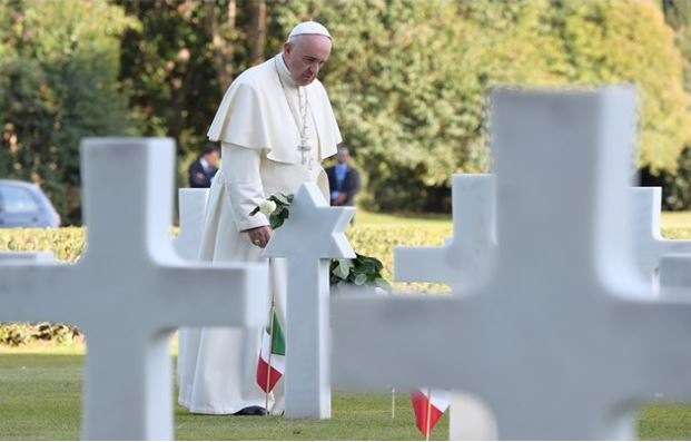 De sokszor előfordul, hogy a remény emberi sebekből nő ki, sok emberi sebbe, fájdalomba ereszti gyökerét, és akkor, amikor fájdalom és szenvedés tölt el minket, amikor sérültek vagyunk, akkor az ég felé fordítja tekintetünket, és azt mondatja velünk: „Hiszem, hogy Megváltóm él, de fogd vissza magad, Uram!” Talán ez az az ima, amely felszakad szívünkből, amikor erre a temetőre tekintünk. „Biztos vagyok, Uram, hogy e testvéreink veled vannak. Biztos vagyok” – ezt mondjuk. „De, kérlek szépen, állj le! Soha többé! Soha többé háborút! Soha többé ne forduljon elő ilyen hasztalan öldöklés” – ahogyan XV. Benedek mondta. Jobb remélni, hogy nem lesz többé ilyen pusztítás: fiatalok ezrei, ezrei, ezrei, ezrei – derékba tört életek.