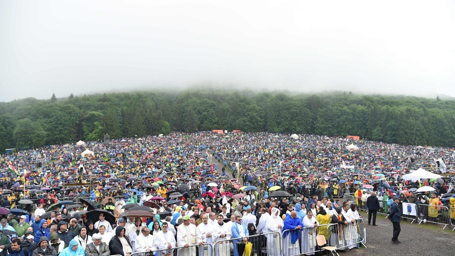 Ezt azonban nem akárhogyan tesszük: zarándokok vagyunk. Ti minden évben, pünkösd szombatján elzarándokoltok ide, hogy eleget tegyetek őseitek fogadalmának, megerősödjetek az Istenbe vetett hitben és a Szűzanya iránti áhítatban, akit ez a fából készült csodálatos szobor jelenít meg. A testvériség jele, hogy ezen a zarándoklaton más felekezetek hívei is részt vesznek. Az idei zarándoklat Erdély öröksége, azonban egyúttal tiszteletben tartja a román és a magyar vallási szokásokat is. Ezen a zarándoklaton más felekezetek hívei is részt vesznek, és ez a párbeszéd, az egység és a testvériség jele. Ugyanakkor felhívás az életté vált hit és a reménnyé lett élet bizonyosságának helyreállítására. Zarándokolni azt jelenti, hogy mint nép hazatérünk. Egy nép, amelynek gazdagsága a számtalan arc, kultúra, nyelv és hagyomány; Isten hívő szent Népe, amely Máriával együtt zarándokol az Úr irgalmát énekelve. Ha a galileai Kánában Mária közbenjárt Jézusnál, hogy megtegye első csodáját, akkor minden kegyhelyen ő virraszt és ő jár közben. Nemcsak Szent Fiánál, hanem mindannyiunknál, hogy ne hagyjuk, hogy azok a hangok és azok a sebek, amelyek az elkülönülést és a megosztottságot táplálják, megfosszanak minket a testvériség érzésétől. Nem szabad elfelednünk vagy tagadnunk a múlt összetett és szomorú eseményeit, azonban ezek nem jelenthetnek akadályt vagy ürügyet, hogy meggátolják a vágyott testvéri együttélést.