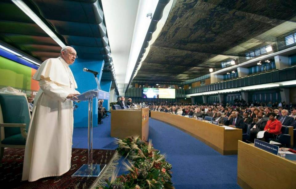 Ha hiszünk az emberi család egységének alapelvében, nem fogadhatjuk el azt, hogy az élelemhez való hozzáférést megakadályozzák politikai vagy gazdasági pressziók. „Itt földgolyónkra gondolok – mondta a pápa, – mely nővérünk és anyánk. Ha megszabadulunk a politikai és gazdasági nyomásoktól, akkor gondját tudjuk viselni földünknek, és megakadályozzuk, hogy elpusztítsa önmagát.” A pápa egy bölcs idős ember szavaira hivatkozott: „Isten mindig megbocsátja a sérelmeket, az emberek néha megbocsátanak, de a föld soha nem bocsát meg.” Viseljük ezért tehát gondját Föld nővérünknek és anyánknak, nehogy pusztítással adjon választ. „E gondolatokat megosztva önökkel – mondta végül a pápa, – kérem a mindenható irgalmas Istent, hogy áldja meg mindazokat, akik a szenvedő embereket felelősen szolgálják. Kérem ugyanakkor a nemzetközi közösséget, hogy hallgassa meg a mostani tanácskozás felhívását: adjunk enni az éhezőknek, és mentsük meg földgolyónk életét.”