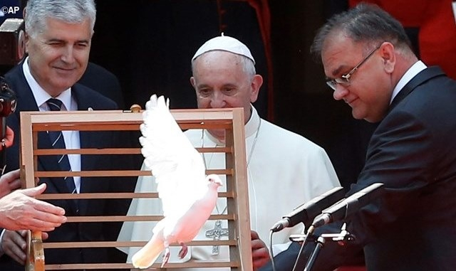 Ferenc pápa elmondta: a béke és a párbeszéd zarándokaként érkezett Szarajevóba tizennyolc évvel elődje, Szent II. János Pál történelmi látogatása után, amely mindössze két évvel a daytoni egyezmény után történt. Örömmel nyugtázza az elért eredményeket és a megbékélés további lépéseire buzdítja e föld lakóit, amelyen horvátok, szerbek és bosnyákok élnek együtt évszázadok óta. Bosznia-Hercegovina Európa szerves része, ezért mindaz, ami ott történik, érinti az egész kontinenst. A három etnikum békés és harmonikus együttélése, a muzulmánok, zsidók és keresztények közötti szívélyes és testvéri kapcsolatok jelentősége jóval túlmutat az ország határain. Az egész világ előtt tanúskodik arról, hogy lehetséges az együttműködés különféle etnikumú és vallású emberek között a közjó érdekében; hogy a kultúrák és hagyományok pluralizmusa eredeti és hatékony megoldásokat szülhet a problémákra; és hogy a legmélyebb sebek is begyógyulhatnak az emlékezet megtisztulási folyamatában, reményt adva az eljövendőnek.