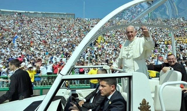 Vannak, akik ezt a légkört akarják megteremteni és eltökélten gerjesztik, különösen azok, akik a különféle kultúrák és civilizációk közti összeütközésre törekszenek és azok is, akik a háborún, a fegyverkereskedelmen nyerészkednek. De ez a háború azt jeleni, hogy gyerekek, nők és idősek élnek menekülttáborokban, erőszakosan kitelepítik az embereket, lerombolják a házakat, az utcákat és a gyárakat, de mindenekelőtt számtalan összetört életet jelent. Ti ezt jó tudjátok, mert éppen itt tapasztaltátok meg, mennyi szenvedés, mennyi pusztítás, mennyi fájdalom jár ezzel. Ma, testvéreim – folytatta a pápa –, ebből a városból újból felhangzik Isten népének és minden jóakaratú embernek a kiáltása: Soha többé háborút!